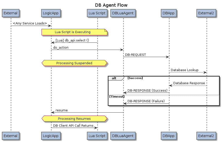 The DBLuaAgent is an asynchronous helper for Lua scripts running within the LogicApp. The DB Agent may be used by any Lua script, regardless of which Service initiated that script.