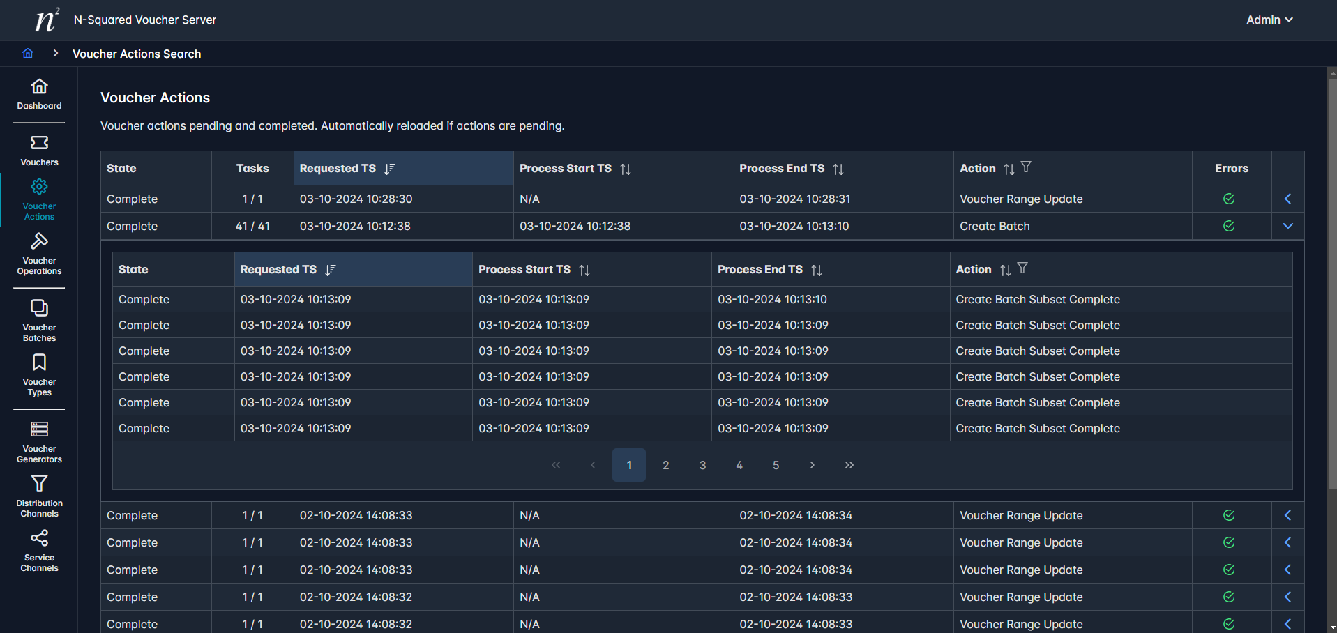 All displayed Voucher Actions will be shown with standard features for searching and sorting available via the table controls.
