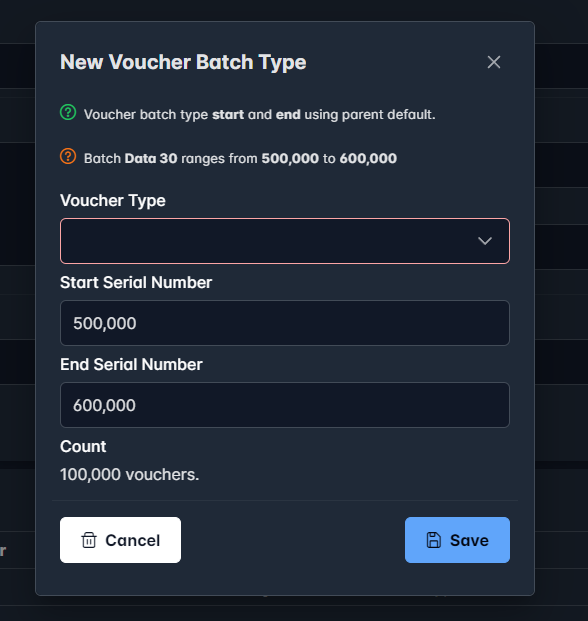 Voucher Batch Types define what kinds of Vouchers will be generated within the Voucher Batch defined range.