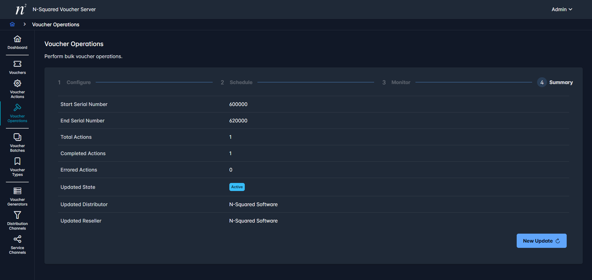 In the following example we will update a Voucher Range between 600,000 and 620,000 marking them as Active, while also setting the Reseller and Distributor fields to N-Squared Software.
